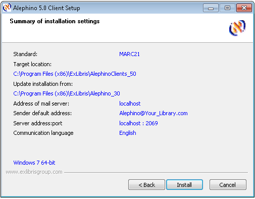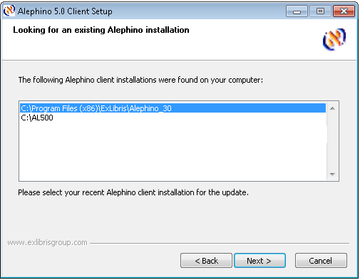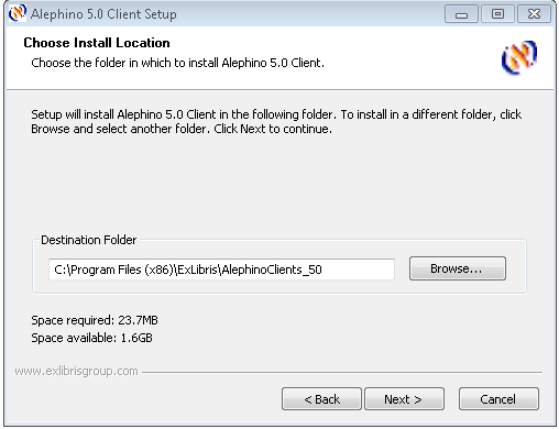 (Defaults: C:\Program files\ExLibris\AlephinoClients_50)