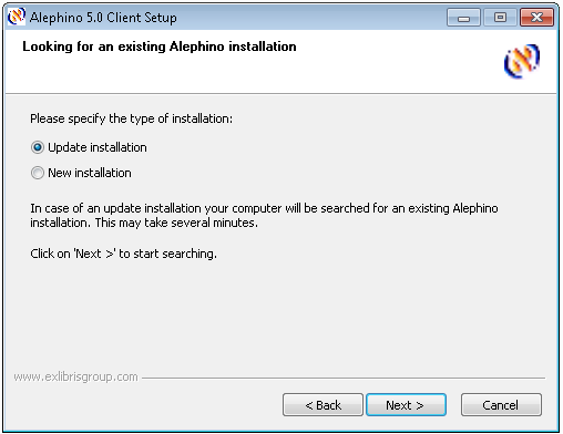 The next dialog offers the opportunity to select the installation type. When Update installation have been choosen, setup will continue with searching on the specified logical drive for existing Alephino GUI installations.